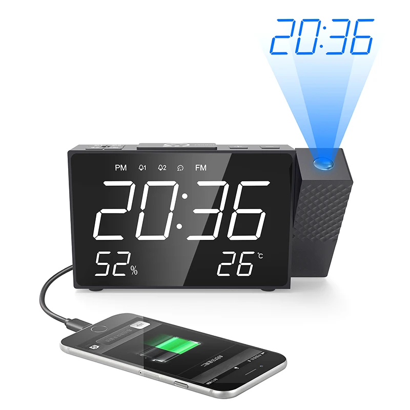 BEST 2019 New Digital Radio Projection Alarm Clock Power Back USB Charger Mirror LED Display Timed Wake